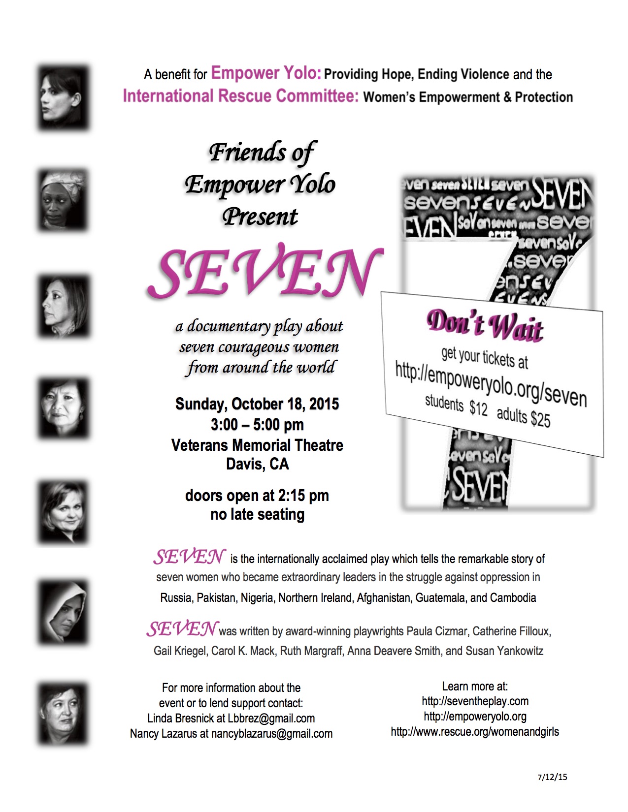 Coming in October, SEVEN will be performed in the California state capital on October 4 and in nearby Davis on October 18.